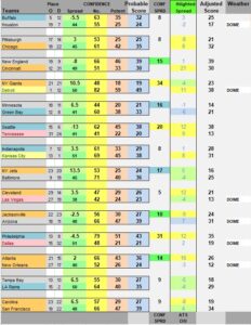 The confidence ( CONF ) column reflects the current Power Rankings for NFL teams. The Confidence Spread ( CONF SPRD ) column reflects the difference between the two teams playing. The higher the CONF SPRD number – the better chance that the winning team will make their predicted score ( Adjusted Score ).