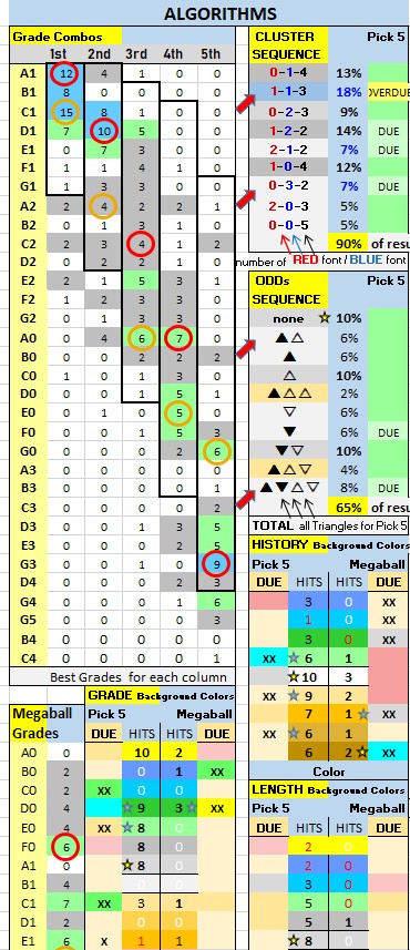 7. LOOK at the Grade Combos table… Consider this info when picking Grades for each number (1st to 5th column) in your five number combo. The BEST Grade Combos are listed under Most Probable (use the Grade Combos table for the best GRADE choices (for each column)..