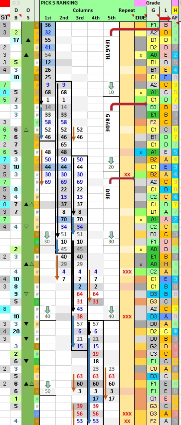 Always include two or three numbers with BEST Grade background Colors (Yellow, Blue, or Green in the “G” column). Refer to CHEAT SHEET Table to determine best combinations (GRADE & LENGTH) or overdue characteristics.