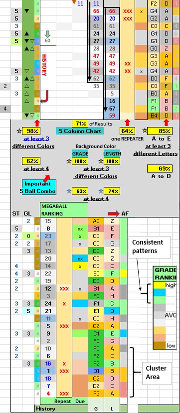 The inner column (right of the five columns of numbers) identifies Repeaters (by XX). The next column to the right reflects both Strength (by color) & Due (by XX). The outer right columns reflects Grade (B1, C2, E3, etc.) & Length (A, B, C, etc.) & Sequence Hits (by color). The inner column (left of the five columns of numbers) reflects History (by color). The next column to the left reflects ODDs Sequence (by symbols ∇, Δ, etc.), and lighter background color reflects Sequence Timing being more favorable. The outer left column reflects Grade/ Length strength, and light Green background color reflects a row being more favorable. Refer to CHEAT SHEET Table to understand the above better, and determine best combinations or overdue characteristics for the 5 Ball Combo.