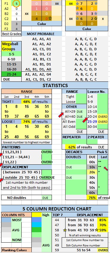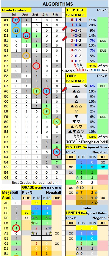 7. LOOK at the Grade Combos table… Consider this info when picking Grades for each number (1st to 5th column) in your five number combo. The BEST Grade Combos are listed under Most Probable (use the Grade Combos table for the best GRADE choices (for each column)..