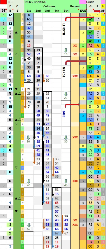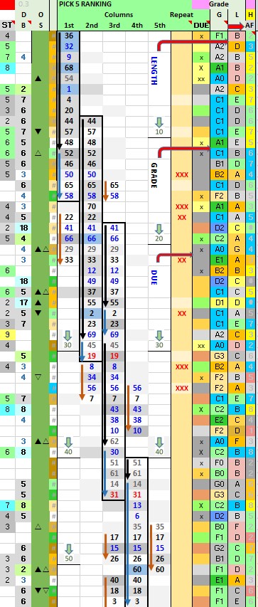 Always include two or three numbers with BEST Grade background Colors (Yellow, Blue, or Green in the “G” column). Refer to CHEAT SHEET Table to determine best combinations (GRADE & LENGTH) or overdue characteristics.