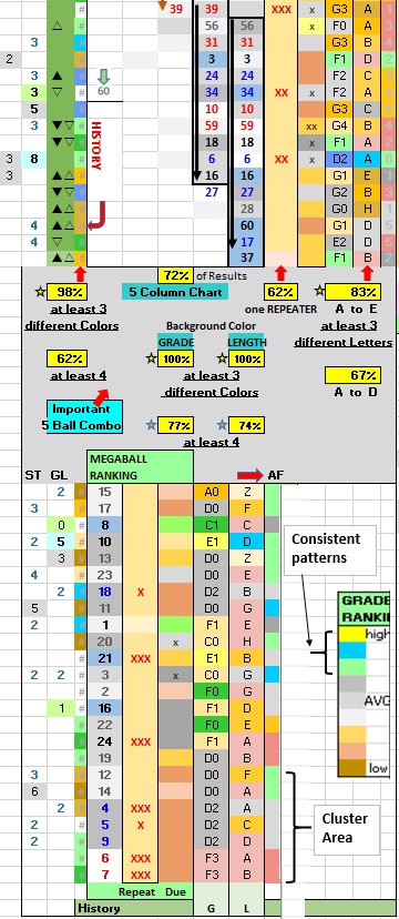 The inner column (right of the five columns of numbers) identifies Repeaters (by XX). The next column to the right reflects both Strength (by color) & Due (by XX). The outer right columns reflects Grade (B1, C2, E3, etc.) & Length (A, B, C, etc.) & Sequence Hits (by color). The inner column (left of the five columns of numbers) reflects History (by color). The next column to the left reflects ODDs Sequence (by symbols ∇, Δ, etc.), and lighter background color reflects Sequence Timing being more favorable. The outer left column reflects Grade/ Length strength, and light Green background color reflects a row being more favorable. Refer to CHEAT SHEET Table to understand the above better, and determine best combinations or overdue characteristics for the 5 Ball Combo.