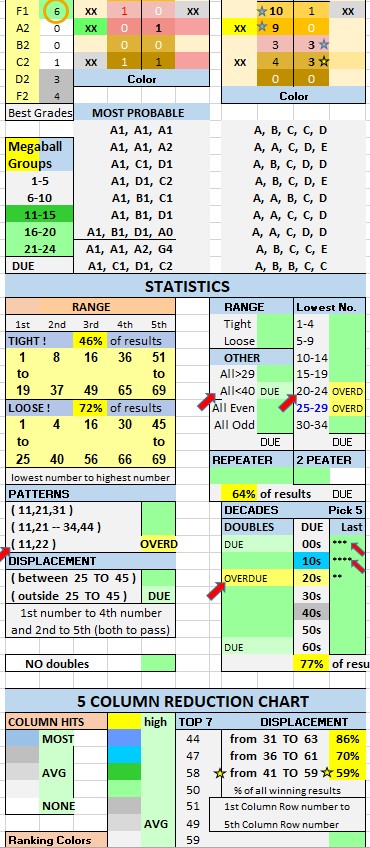 6. LOOK at the DECADES table… Consider this info when picking which Decades ( e.g. 10s, 20s, etc.) will be included in your five number combo… Consider the DECADE DUE background color when picking your five number combo for best picks ( look at RANKING table for background color strength ).