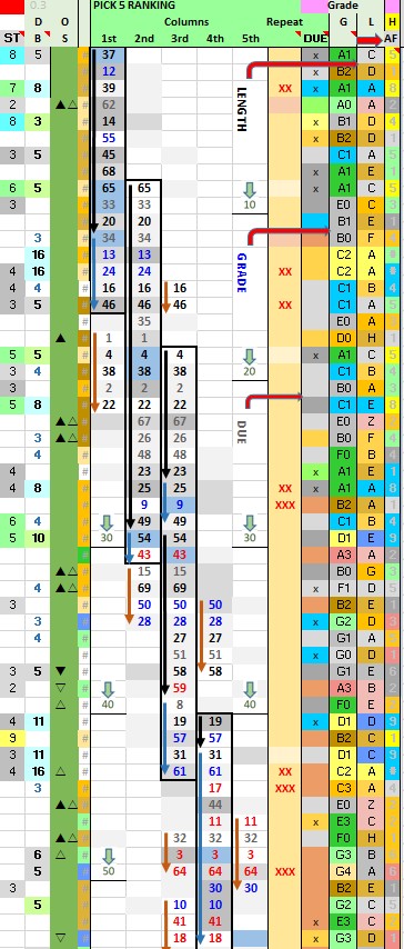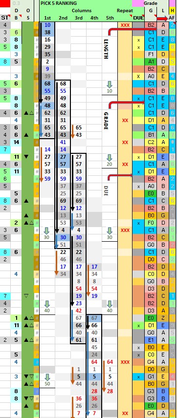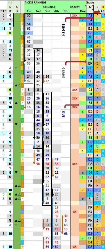 Always include two or three numbers with BEST Grade background Colors (Yellow, Blue, or Green in the “G” column). Refer to CHEAT SHEET Table to determine best combinations (GRADE & LENGTH) or overdue characteristics.