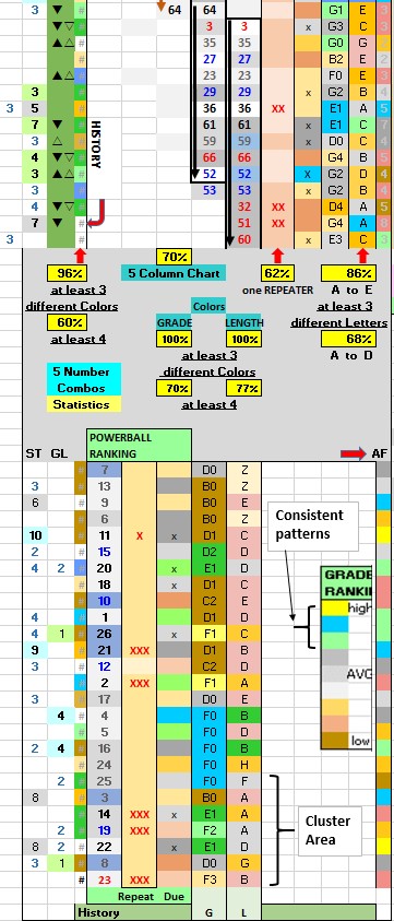 The inner column (right of the five columns of numbers) identifies Repeaters (by XX). The next column to the right reflects both Strength (by color) & Due (by XX). The outer right columns reflects Grade (B1, C2, E3, etc.) & Length (A, B, C, etc.) & Sequence Hits (by color). The inner column (left of the five columns of numbers) reflects History (by color). The next column to the left reflects ODDs Sequence (by symbols ∇, Δ, etc.), and lighter background color reflects Sequence Timing being more favorable. The outer left column reflects Grade/ Length strength, and light Green background color reflects a row being more favorable. Refer to CHEAT SHEET Table (below) to understand the above better, and determine best combinations or overdue characteristics for the 5 Ball Combo.