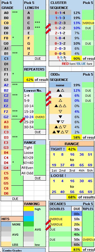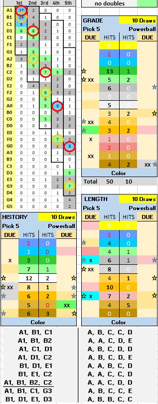 1. LOOK at the Pick 5 GRADE table… RED font & BLUE font Grades are identified… Darker background color of Grades reflects best picks (look at HITs table for background color strength). Best picks for Grades (Due ** / Overdue ****).