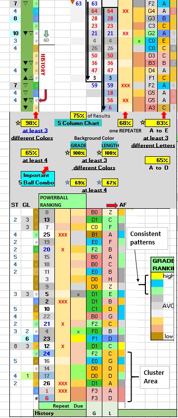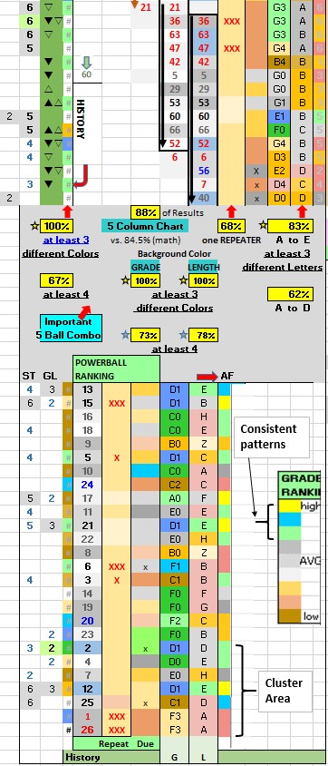 The inner column (right of the five columns of numbers) identifies Repeaters (by XX). The next column to the right reflects both Strength (by color) & Due (by XX). The outer right columns reflects Grade (B1, C2, E3, etc.) & Length (A, B, C, etc.) & Sequence Hits (by color). The inner column (left of the five columns of numbers) reflects History (by color). The next column to the left reflects ODDs Sequence (by symbols ∇, Δ, etc.), and lighter background color reflects Sequence Timing being more favorable. The outer left column reflects Grade/ Length strength, and light Green background color reflects a row being more favorable. Refer to CHEAT SHEET Table to understand the above better, and determine best combinations or overdue characteristics for the 5 Ball Combo.