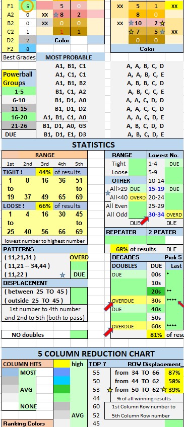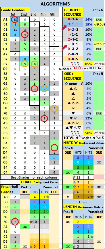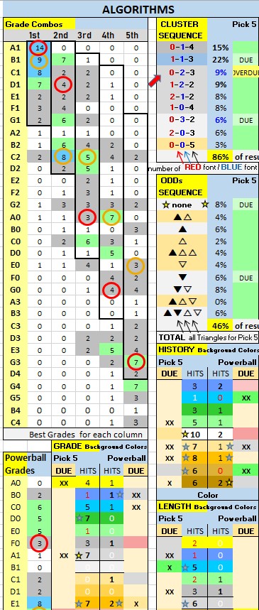 7. LOOK at the Grade Combos table… Consider this info when picking Grades for each number (1st to 5th column) in your five number combo. The BEST Grade Combos are listed under Most Probable (use the Grade Combos table for the best GRADE choices (for each column)..