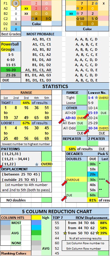 6. LOOK at the DECADES table… Consider this info when picking which Decades ( e.g. 10s, 20s, etc.) will be included in your five number combo… Consider the DECADE DUE background color when picking your five number combo for best picks ( look at RANKING table for background color strength ).