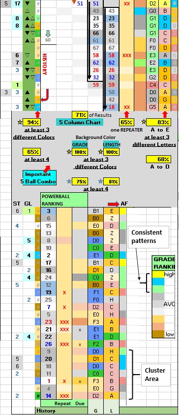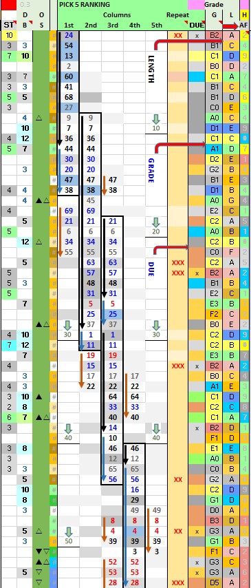 The inner column (right of the five columns of numbers) identifies Repeaters (by XX). The next column to the right reflects both Strength (by color) & Due (by XX). The outer right columns reflects Grade (B1, C2, E3, etc.) & Length (A, B, C, etc.) & Sequence Hits (by color). The inner column (left of the five columns of numbers) reflects History (by color). The next column to the left reflects ODDs Sequence (by symbols ∇, Δ, etc.), and lighter background color reflects Sequence Timing being more favorable. The outer left column reflects Grade/ Length strength, and light Green background color reflects a row being more favorable. Refer to CHEAT SHEET Table to understand the above better, and determine best combinations or overdue characteristics for the 5 Ball Combo.